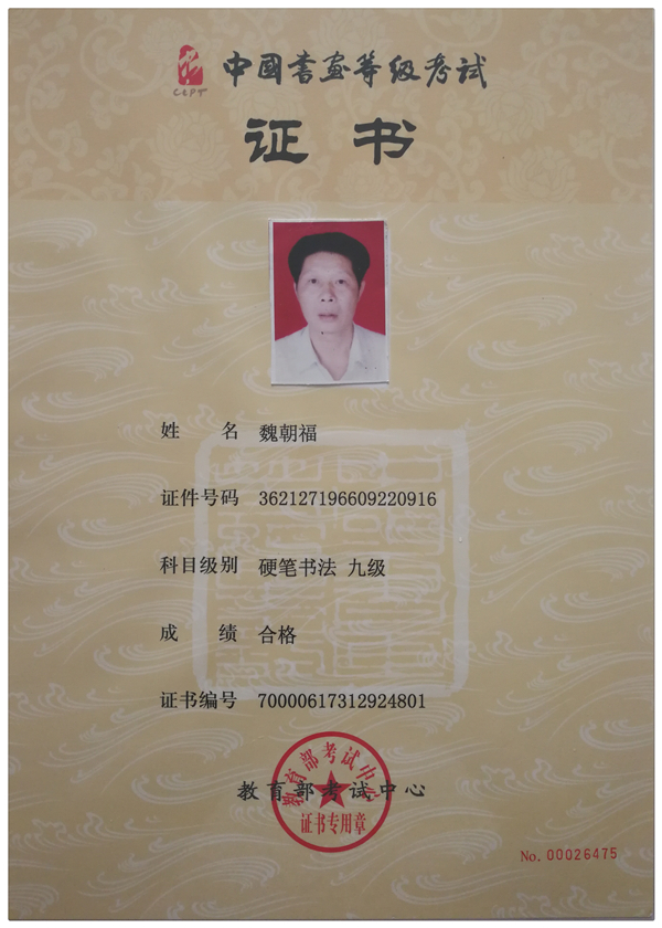 魏朝福,男,1966年9月出生,大专文化,系江西省赣州市定南县人。赣州市书法协会会员,北京宣和书画艺术研究院副院长,国家教育部硬笔书法九级、江西省毛笔书法九级获得者。《定南书画院》创始人,担任定南书画院院长。自幼学习书法,喜欢诗、词、歌、赋,酷爱书法艺术,经过几十年的书法积淀,终成正果,书法作品多次在各级书法大赛中获奖。篆、隶、楷、行、草五大书体皆精,尤善工楷、行、草,最为擅长硬笔书法。硬笔书法的造诣达到了登峰造极的水准。荣获国家教育部硬笔书法最高等级九级殊荣,毕生致力于精研书法教学,著有《硬笔楷书入门速成教程1十1》,深受广大书法爱好者青眯。在全国各地开设多家书法培训机构,旗下门徒众多,培训机构火爆。江西省书法家协会毛笔书法九级。