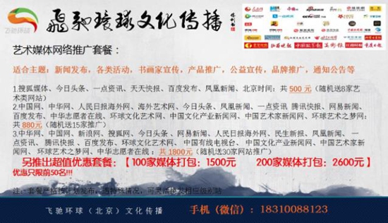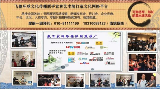 飞驰环球文化集团现拥有近300家网络权威媒体、行业门户网站联盟,使您的书画作品、艺术类新闻播报在全国全网覆盖宣传,对艺术机构及艺术家个人知名度的建设起到强有力的推动提升作用!